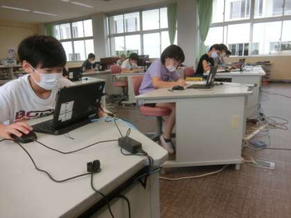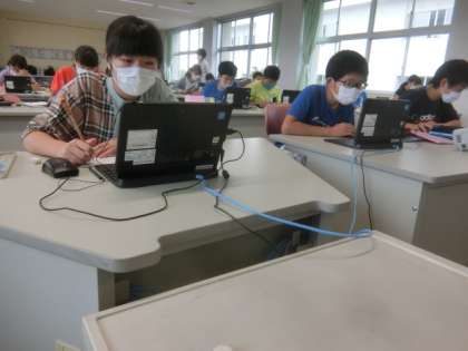 コンピュータ室の6年生。どうやら、インターネットで、「節電」について調べているようです。