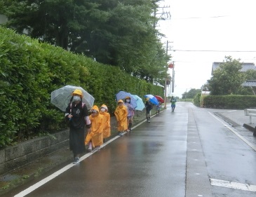子供たちは、今朝も雨の中の登校となりましたが、列を乱さずに歩いています。