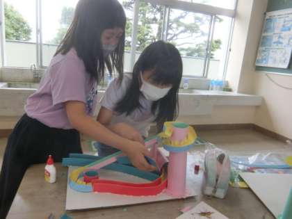 ビー玉が楽しく遊べるように知恵をしぼり、互いの工夫のよさを認め合いながら、楽しく工作を進める4年生。