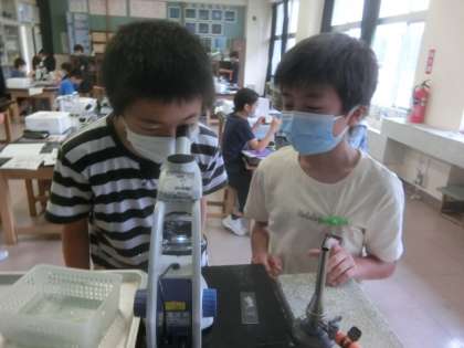 理科室の6年生。一人一人、ムラサキツユクサの葉を裂いてプレパラートをつくり、顕微鏡で気孔を観察しました。