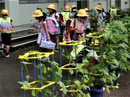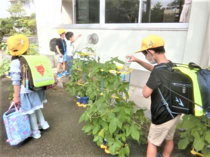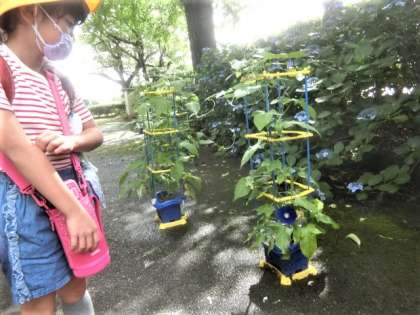 長岡小学校のアサガオ開花、第1号。紫の花です。