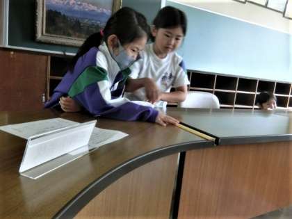 30cmものさしで、身の回りにある物の長さ調べをする2年生。