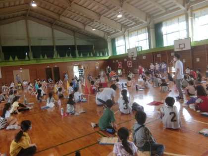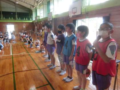 富山市の小学校スポーツ推進連盟が考案した体力向上推進事業「わざ7」の説明会を体育館で開催。5・6年生が、司会進行をしました。