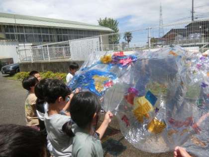 子供たちが作ったセロファンの作品に日光を当て、反射や影などを楽しむ図画工作科の学習のようです。このような楽しみ方もあるのだと知りました。