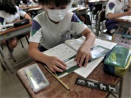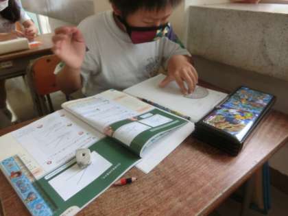 4年生の算数科。角の大きさを分度器で測定しています。