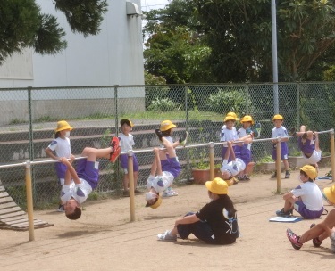 走・跳・投の運動に加えて、鉄棒運動も充実させ、子供たちの体力・運動能力をバランスよく育成していきたいと考えています。