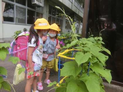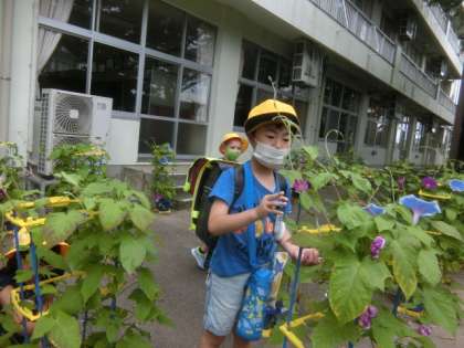 今朝は、今までで最もたくさんのアサガオが開花。1年生は、大喜びです。
