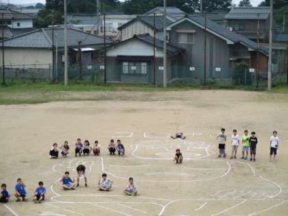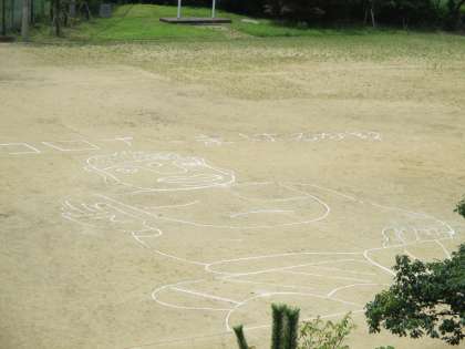 グラウンドに、原寸大の奈良の大仏を描きました。仏教の力で世の中を安定させようと考えた聖武天皇に習い、「コロナに負けるな!」と添えて、感染症流行の終息を願いました。