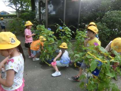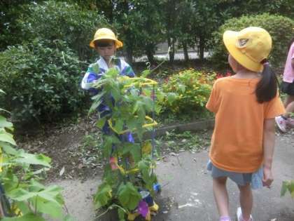 互いのアサガオの開花を喜び合う1年生。