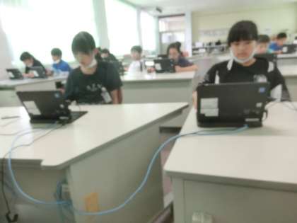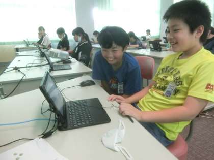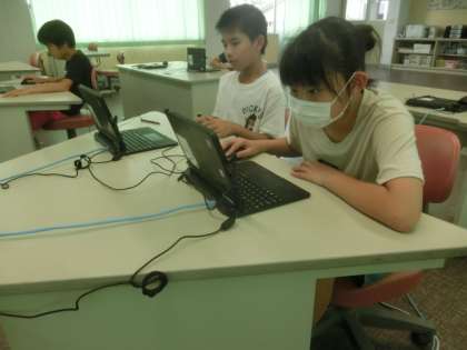 コンピュータ室の5年生。プログラミング学習に挑みます。