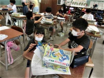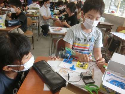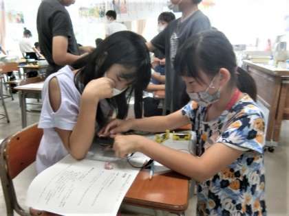 4年生の理科の学習。配線を変えて、モーターの回り方の変化を調べています。