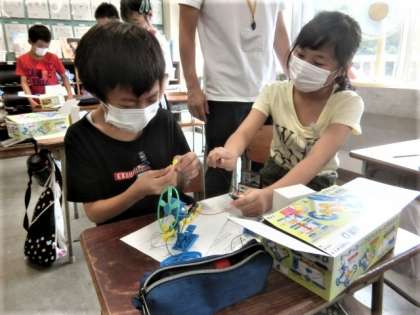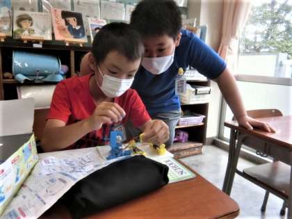 友達と話し合いながら、乾電池とモーターのつなぎ方を変え、モーターの回り方の変化に注目する4年生。