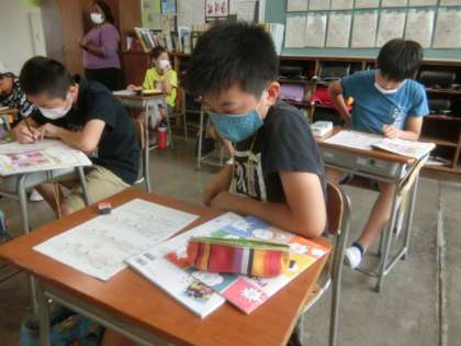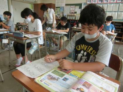 外国語科の学習。今日は、これまでの学習の振り返りをしています。1学期だけでも、たくさんの英語を学びました。