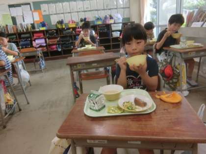 今日の献立は、ごはん、牛乳、フクラギの照り焼き、呉汁、昆布和え、ふりかけです。いただきます。