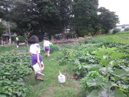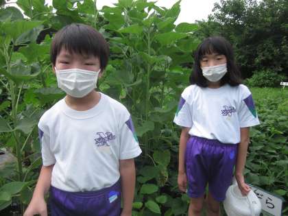 農園に植えたヒマワリには、高さが大人の身長を超えたものもありました。今は、花が咲く日を楽しみにしています。