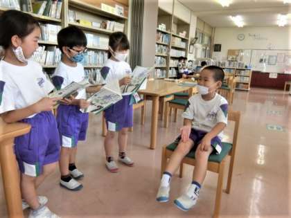 図書室の1年生。グループごとに、役割を決めて、音読劇の練習中。