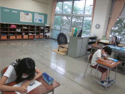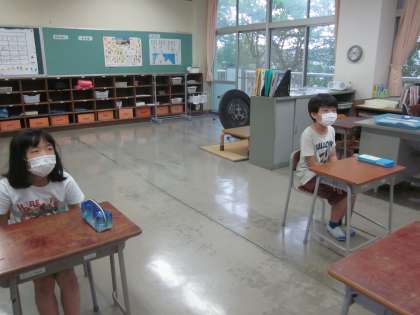 1学期終業式は校内放送で行いました。前を向いて、しっかりと聞きました。校長先生の問題に興味深く取り組みました。