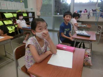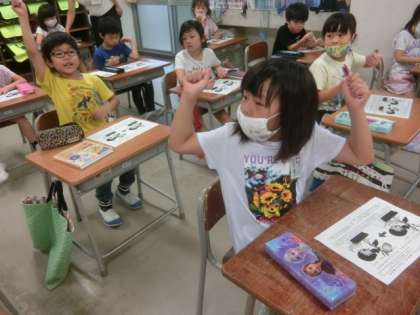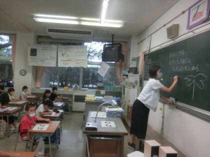 1学期最終日の1年生教室。育ててきたアサガオの学習でしめくくりました。