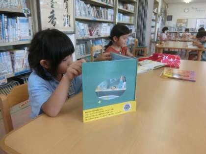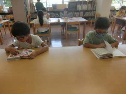 昼休憩。図書室で読書に親しむ子供たち。様々な学年の子供たちが、来室していました。