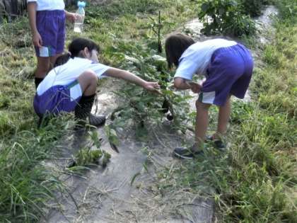 2年生は、今日も農園へ出かけました。画像は、ナスを収穫しているところです。