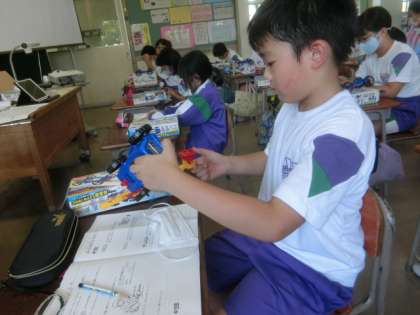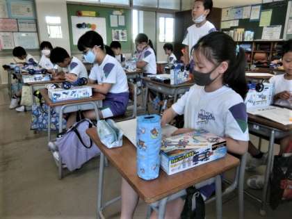 3年生の理科学習。ゴムの伸縮による車の走り方の違いを調べるようです。