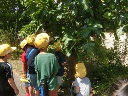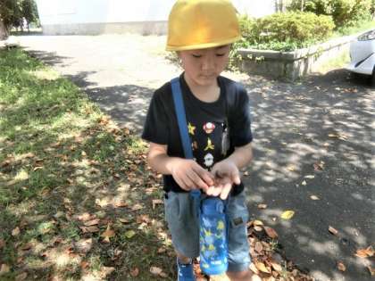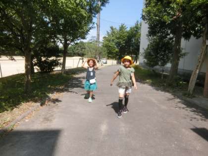 休憩時間。「暑くても外がいい。」と、昆虫探しなどを楽しむ1年生。