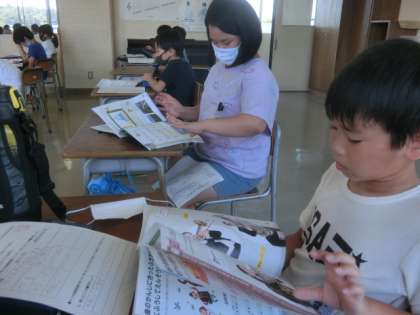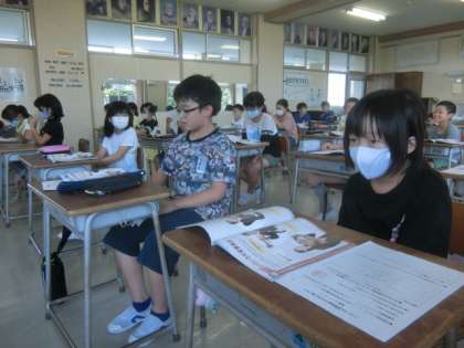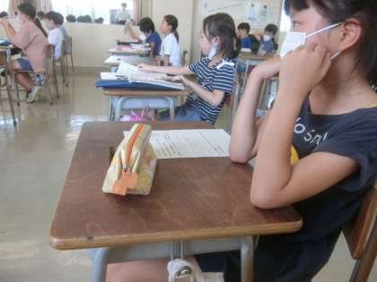 音楽室で、楽器の音色を聞き分ける学習をする3年生。