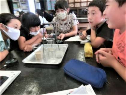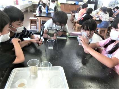 理科室で、砂に水がしみこむ様子を観察する4年生。