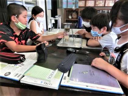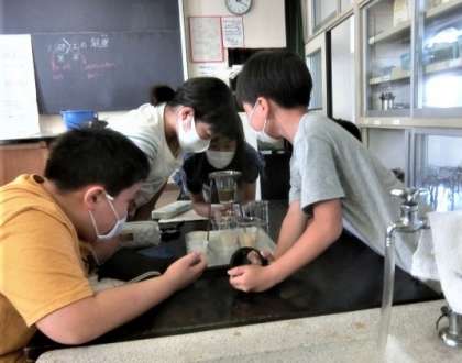 砂に水がしみこむ様子を観察する4年生。ストップウオッチで、時間も計っています。