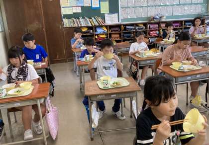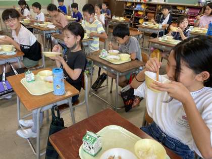 3年生教室のランチタイム。今日の献立は、ご飯、牛乳、八宝菜、小魚入りフライビーンズ、ゆでブロッコリーです。