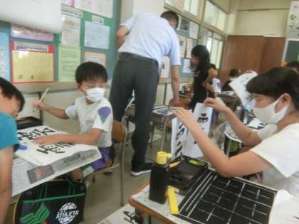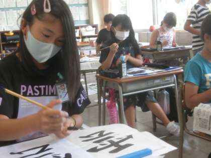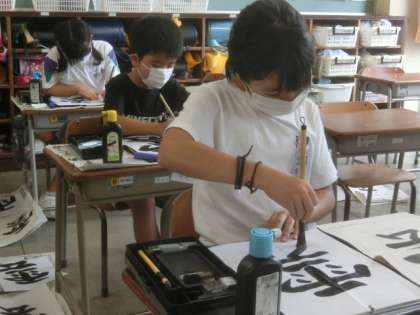4年生の毛筆書写。題字は「雲」。友達に、どちらの作品がいいか尋ねる姿がみられました。