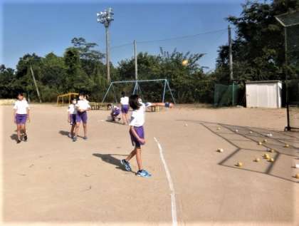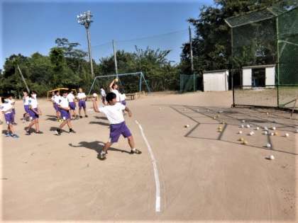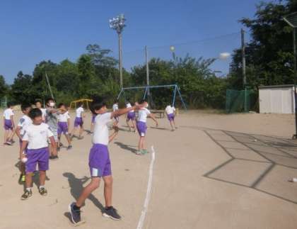 ボール投げの学習からスタート。今日のテーマは、「狙って投げる」です。