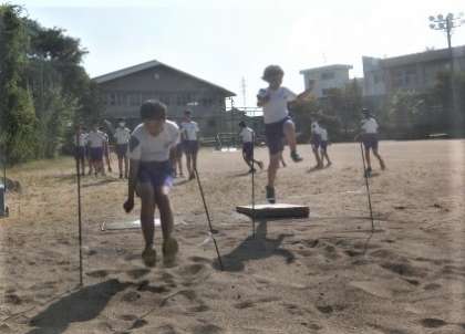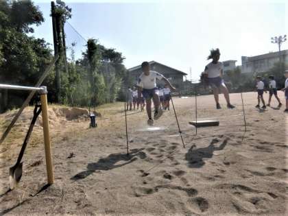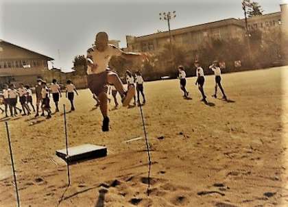 走り幅跳びの練習。「鋭く踏み切って高く跳ぶ」が、今日のテーマです。