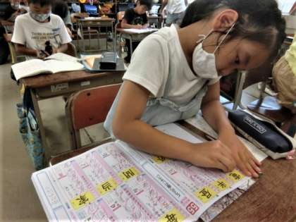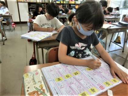 漢字の学習帳で、漢字の読み方、筆順、熟語を学ぶ2年生。