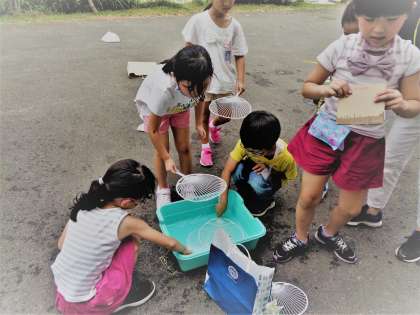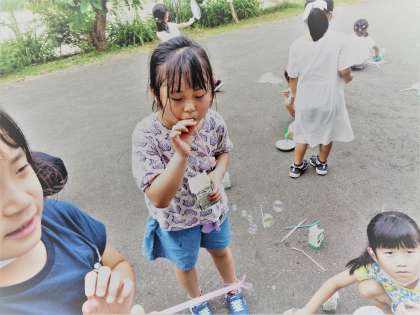 1年生。体育館前でシャボン玉遊びを楽しみました。