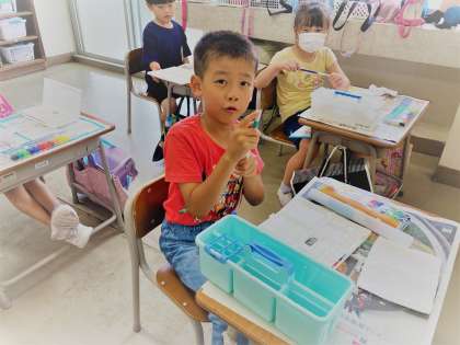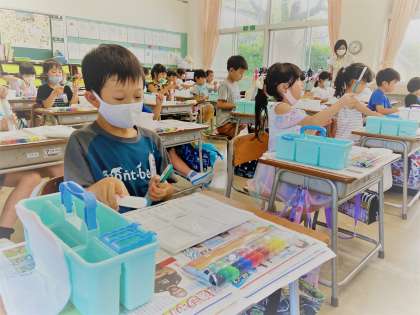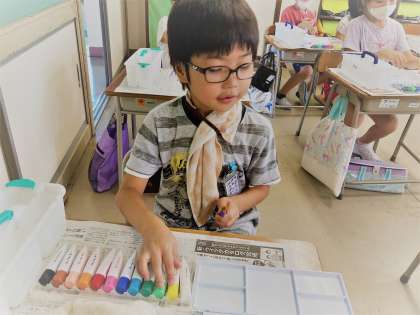 1年生は、水彩絵の具の使い方を学習。まず、水彩バケツに水を入れ、机のどこに何を置くか学びました。
