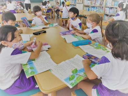 図書室で、国語の教科書を広げ、グループで学び合う1年生。