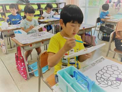 ブドウの絵が描かれた画用紙に、混色した色や水で薄めた色を筆で慎重に置いていく1年生。
