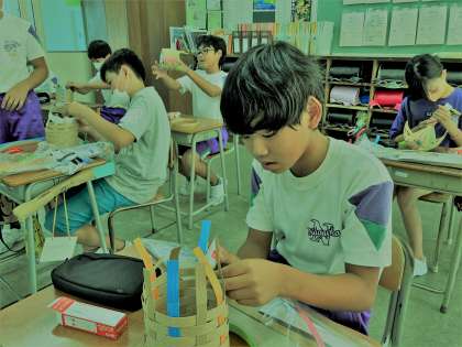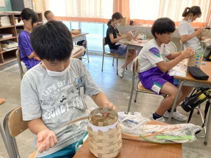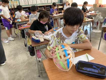 紙バンドを編み込みながら、小物入れなど生活に役立つ物を作っています。
