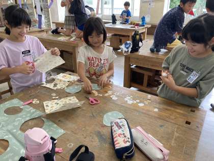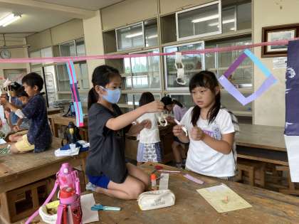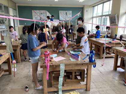 2年生のアイディアや感性がちりばめられて、図工室は見違えるように楽しげなスペースになりました。
