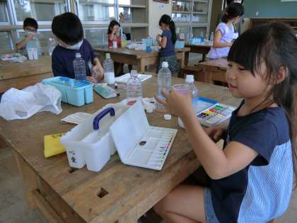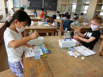 図工室の1年生。水彩絵の具で色水をつくっています。