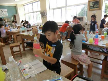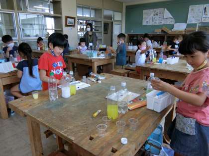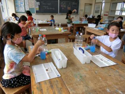水彩絵の具でつくった色水を混ぜて、色の変化を楽しむ1年生。