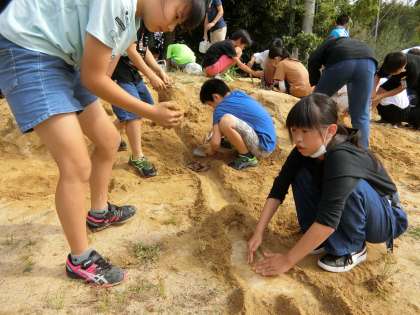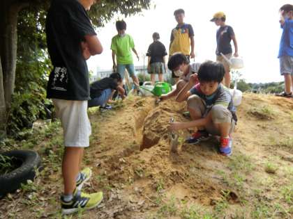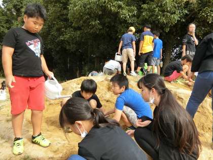 川を掘り水を流して、流水の三作用を調べる5年生。