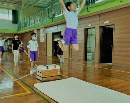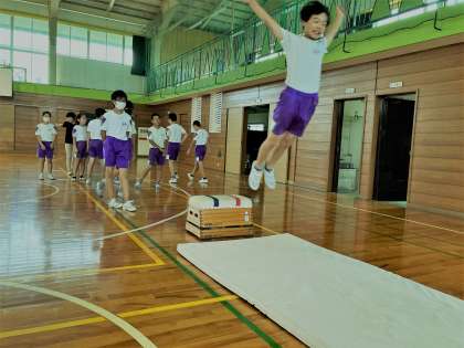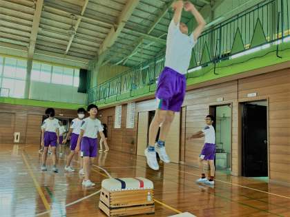 グラウンドコンディションがよくなかったので、体育館で幅跳びの練習をしました。