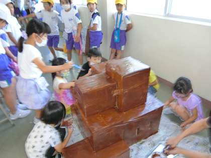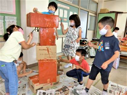 10月17日(土)の学習発表会に向けて、協力して大道具づくりをする1年生。