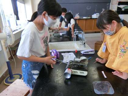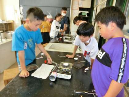 甘い香りが漂う理科室。砂糖水を加熱して、べっこう飴を作っているようです。
