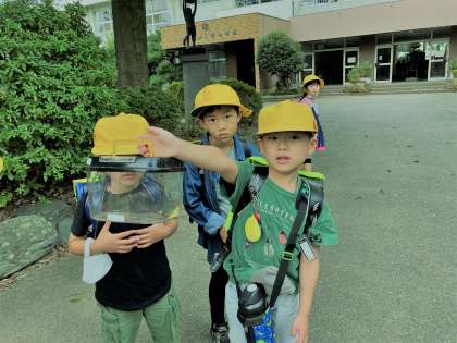 1年生には、虫かごを持って登校する子が複数います。早速、コガネムシを捕まえて虫かごに入れたところです。