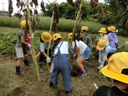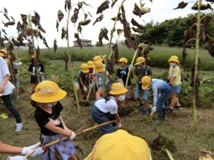 3年生が育てたヒマワリ。大きく育ちました。今日は、種をとるのだそうです。