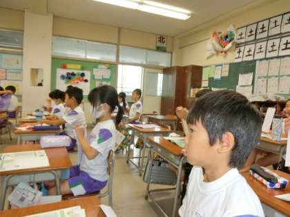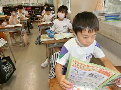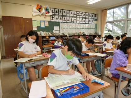 国語科の学習。宛名や差出人の書き方等、封筒のどこに何をどのように書くのか学ぶ3年生。