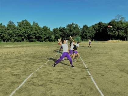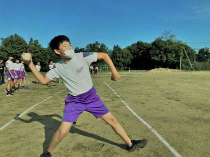 秋晴れの朝。気持ちよくジャベリックボールを投げる6年生。
